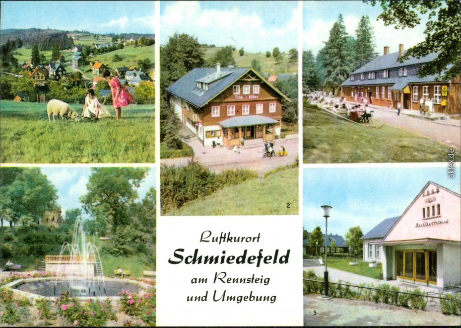 Ansichtskarte: Blick auf Vesser, Filmbühne, Stutenhaus, Springbrunnen, Kulturhaus - Schmiedefeld (Rennsteig)