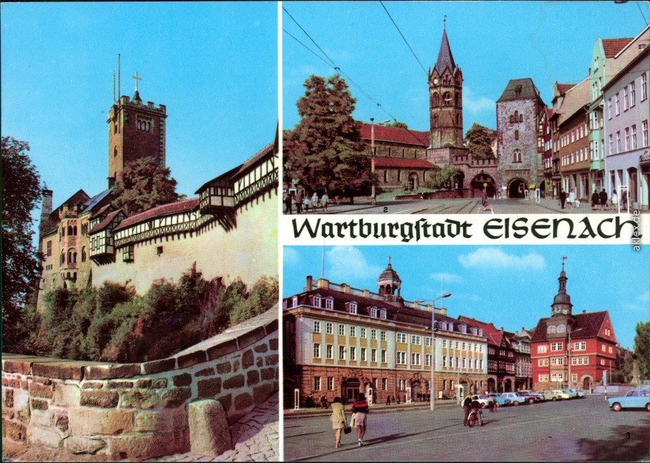 - Wartburg von Osten, Nikolaikirche und Nikolaitor, Thüringer Museum und Rathaus