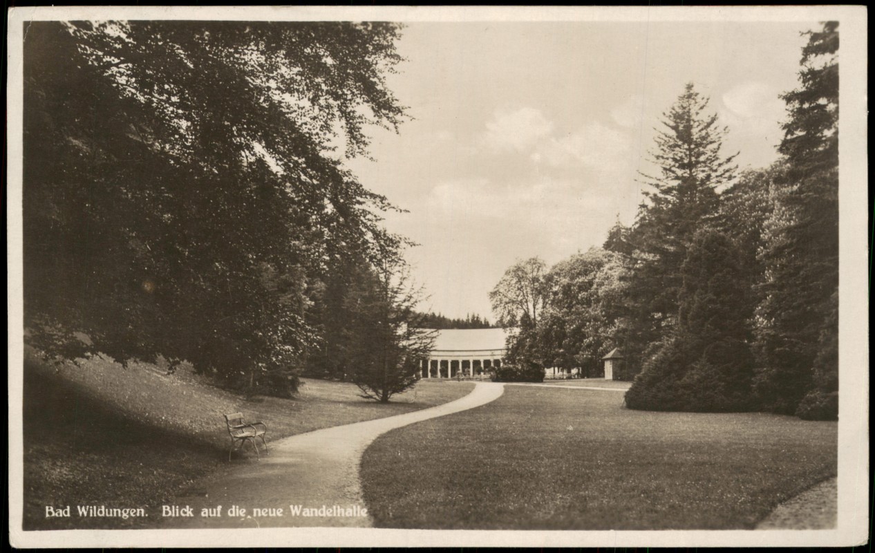 - Ansichtskarte Bad Wildungen Kurgarten mit neue Wandelhalle 1930