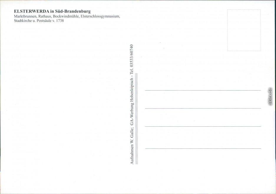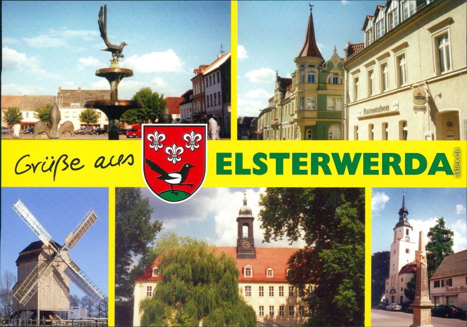 - Marktbrunnen, Rathaus, Bockwindmühle, Elsterschlossgymnasium, Stadtkirche u. Postsäule