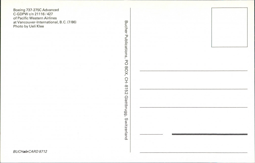 Ansichtskarte: Flugzeug - Boeing 737-275C Advanced Pacific Western Airlines - Vancouver