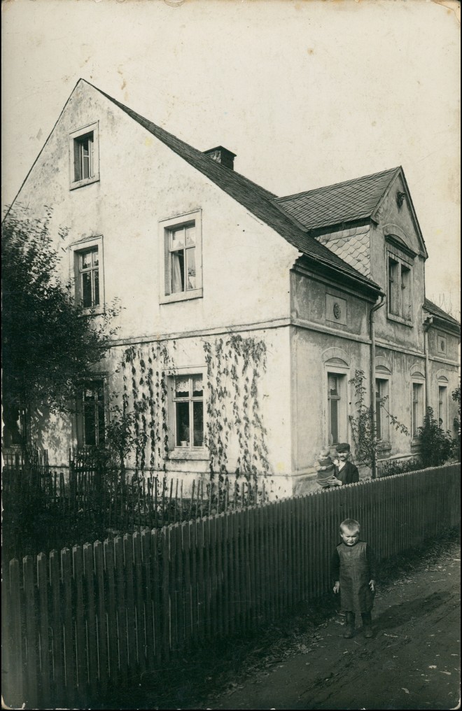 Ansichtskarte: Vater mit Kind auf dem Arm und kleinen Jungen vor dem Haus, Dresden