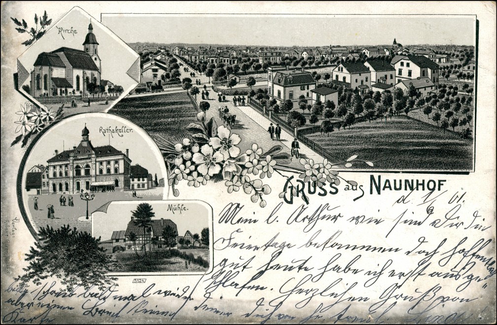 Ansichtskarte: Kirche, Straße, Mühle - Naunhof