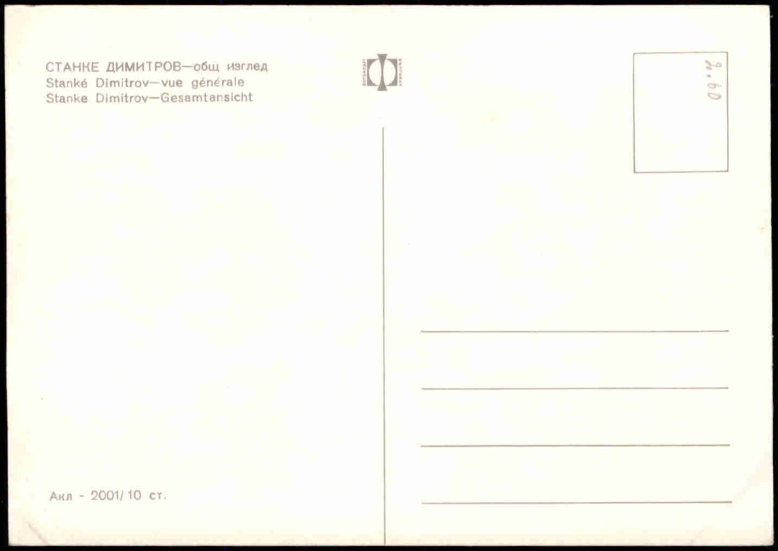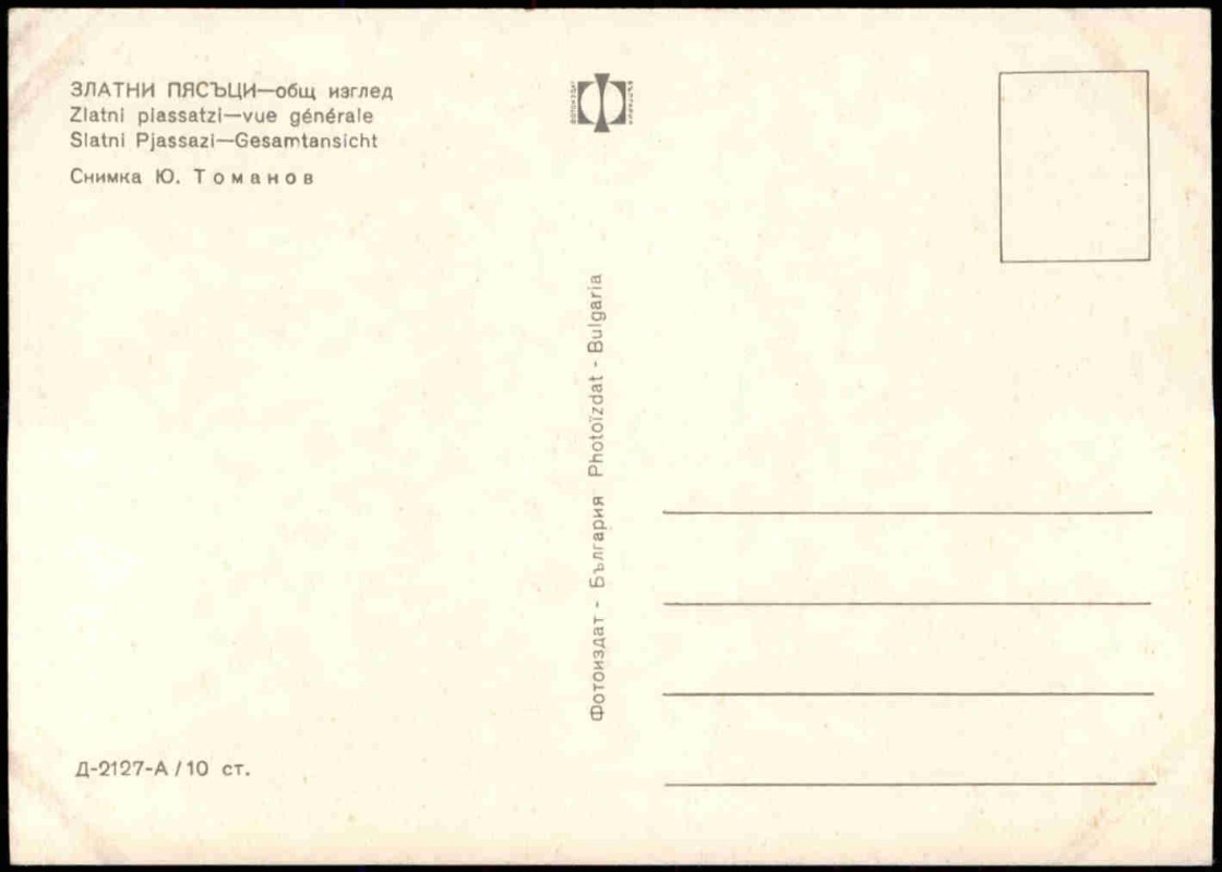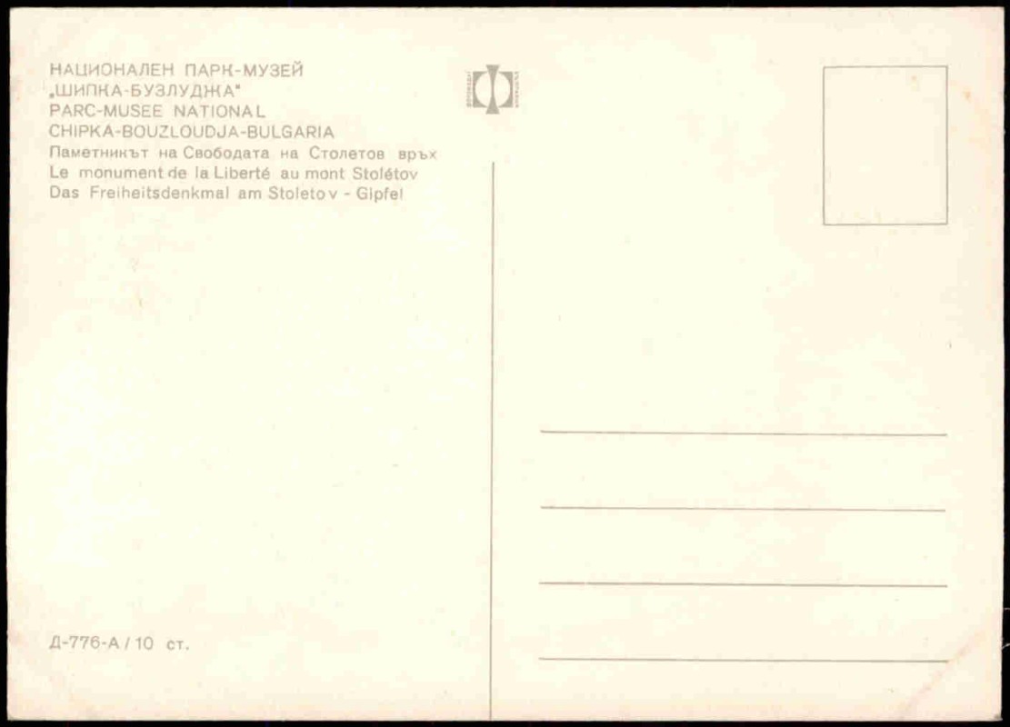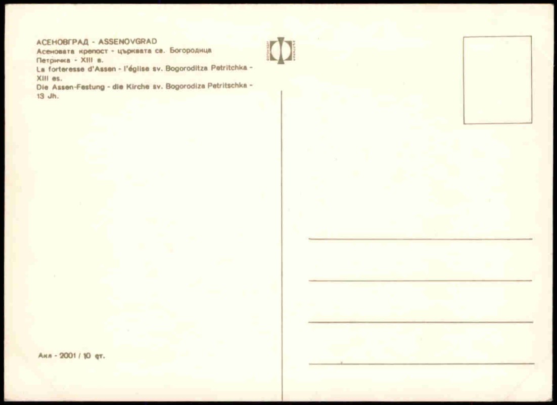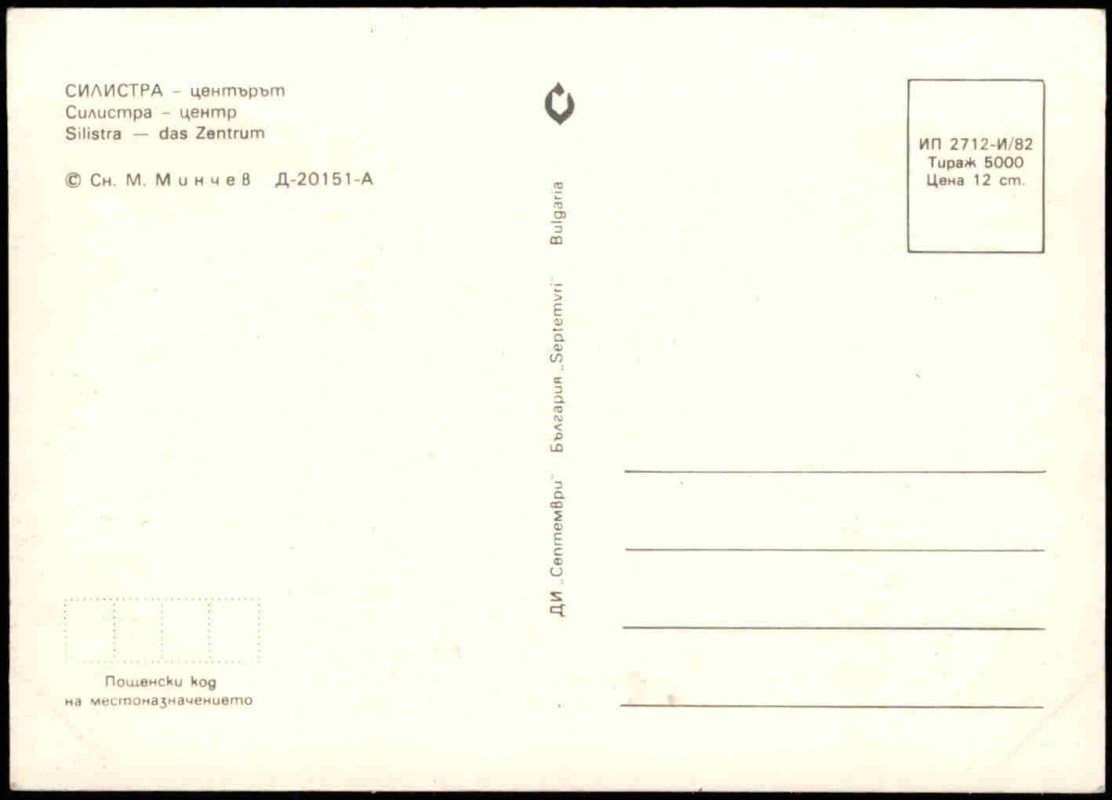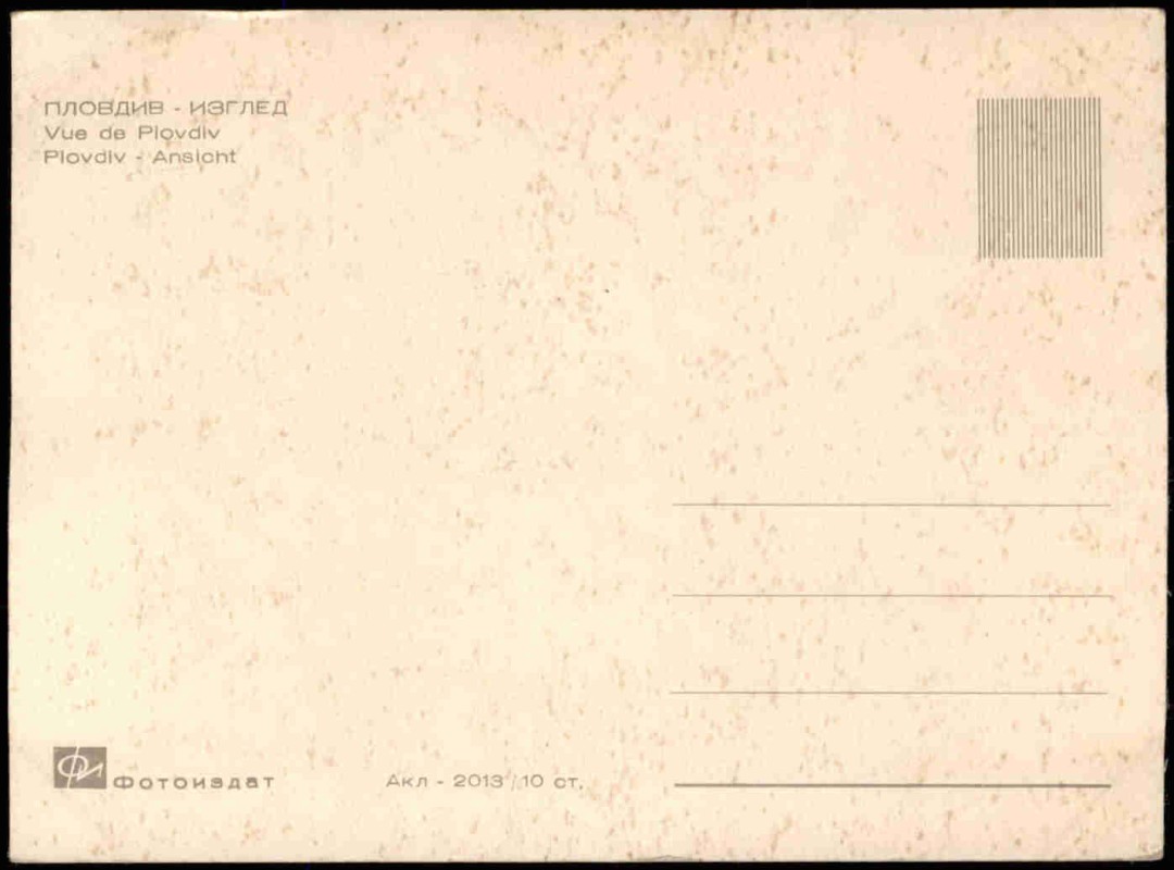 - БАЛКАНТУРИСТ БУРГАС BALKANTOURISTE BOURGAS BULGARIA Плаващ бар „Ропотамо" Bar flottant Ropotamo Schwimmende Bar Ropotamo A-4199-A/10 CT. ЗЛАТНИ ПЯСЪЦИ-общ изглед Zlatni plassatzi-vue générale Slatni Pjassazi-Gesamtansicht Снимка Ю. Томанов Д-2127-A/10 CT. Фотоиздат - България Photoizdat - Bulgaria КЪМПИНГ МИЧУРИН - MITCHOURINE Къмпинг "Оазис" Camping Oisisse M-1708-A/10 CT. Оформление Ив. Урумов Фотоиздат M-74/10 CT. CLUB AGENCE TOURISTIQUE CHIPKA SOFIA 6, rue Sveta Sofia Tél. 87-06-23 Telex 22682 Touring EG ULGARIE BUL ОАЗИС HECEGBP Пловдив- ИЗГЛЕД Vue de Plovdiv Plovdiv Ansicht Фотоиздат Акл - 2013 /10 ст. СТАНКЕ ДИМИТРОВ-общ изглед Stanké Dimitrov-vue générale Stanke Dimitrov-Gesamtansicht Акл - 2001/ 10 ст. 2.60 ВЕЛИНГРАД BEЛHEPAД- VÉLINGRAD ГРАД Оформление: художник П. Койчев Présentation artistique: peintre P. Koitebev ИСКЪРСКОТО ДЕФИЛЕ JDR 8 БЪЛГАРИЯ VEB Draftfahrzug instead - гис setchypwerk Belle 4K CMAAN Cheannme.ce СИЛИСТРА - центърът Силистра - центр Silistra das Zentrum © Сн. М. Минчев Пощенски кog на местоназначението A-20151-A tift България Septemvri Bulgaria ДИ Септември" НАЦИОНАЛЕН ПАРК-МУЗЕЙ „ШИПКА-БУЗЛУДЖА" PARC-MUSEE NATIONAL CHIPKA-BOUZLOUDJA-BULGARIA Паметникът на Свободата на Столетов връх Le monument de la Liberté au mont Stolétov Das Freiheitsdenkmal am Stoletov - Gipfel PYCE Russe M-6525-A Panteon (das Museum 2. Die Porucke den Freundlich keit gas Theaterhaus 3. България Septemvri Bulgaria A-776-A/10 CT. Пощенски коg на местоназначението nd พอเนอว" ท АСЕНОВГРАД - ASSENOVGRAD Асеновата крепост църквата св. Богородица Петричка - XII в. La forteresse d'Assen - l'église sv. Bogoroditza Petritchka- XIII es. Die Assen-Festung - die Kirche sv. Bogorodiza Petritschka - ип 2712-и/82 Tupaжk 5000 Цена 12 ст. 13 Jh. PYCE ип-4346-и/87 Tupaжk 10 000 Цена 18 ст. AKA-2001/10 qr. ВИДИН - VIDINE Крепостта „Баба Вида" La forteresse Baba Vida Die Festung Baba Wida Снимка: В. Искренов PYCAAKA КУРОРТ РУСАЛКА Station Roussalka Kurort Russalka РИЛА - връх Харамията Фотоиздат България Photoizdat - Bulgaria M-1971-A тир. 15000 A-5 Отпечатано BbB Фотографика ИП 17/1973 Цена 10 ст. ПО ВЪЗДУХА PAR AVION Каскада «Сестримо» Акл-2005 / 10 ст. Рила - Вершина Харамията Rila Rila le mont Kharamiata der Gipfel Charamijata Какви плавза Виждала былzapuя Septemvri НРБЪЛГАРИЯ 20 TAP (DDR) Nervena rolliche Holy Kreispoliklinik Karpater armick. Russe Пощенски код на местоназначението