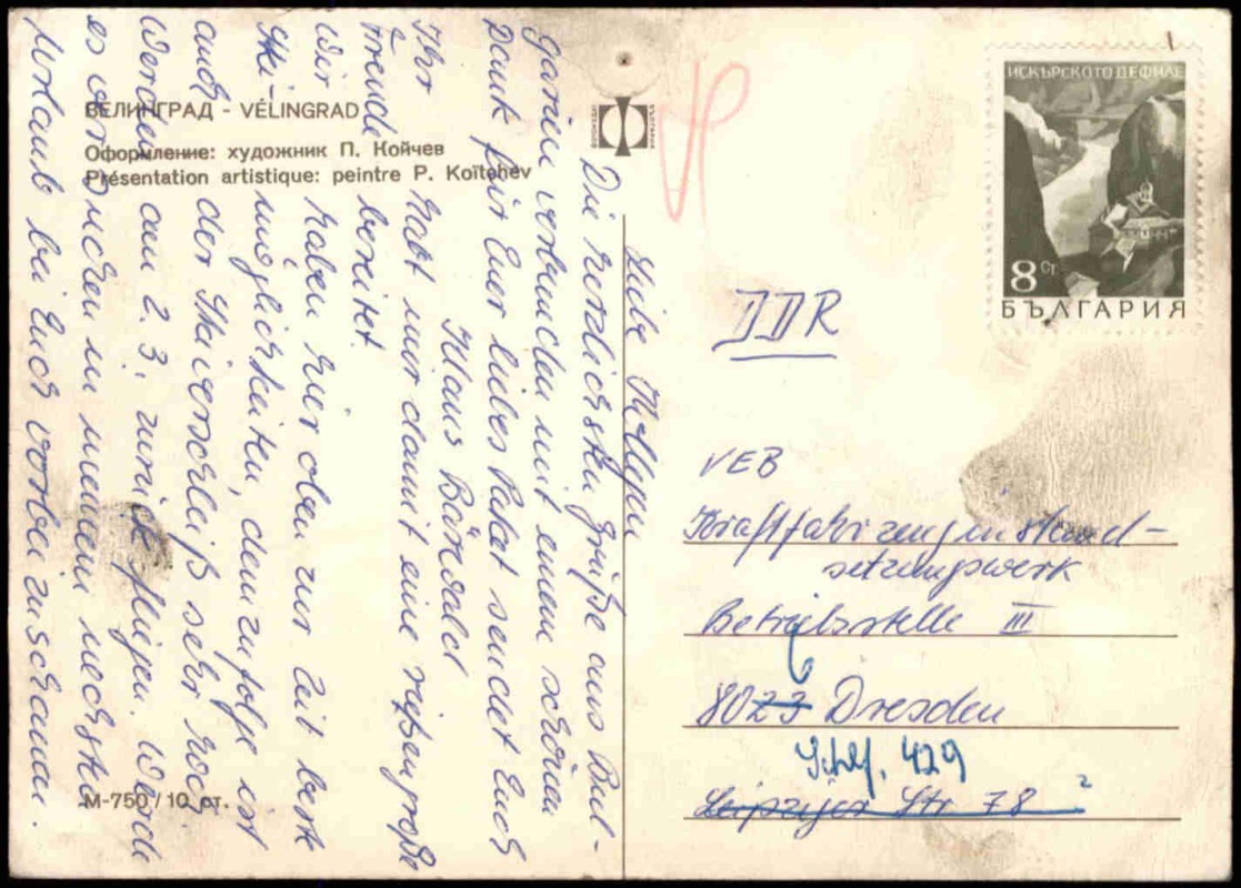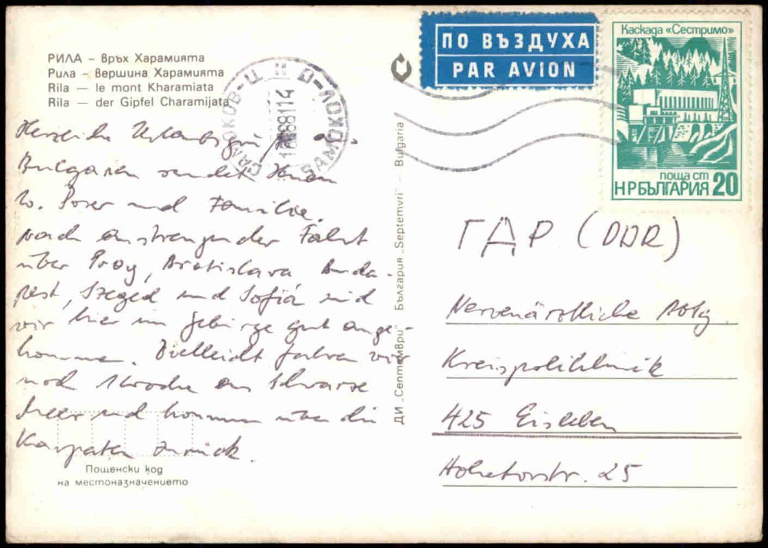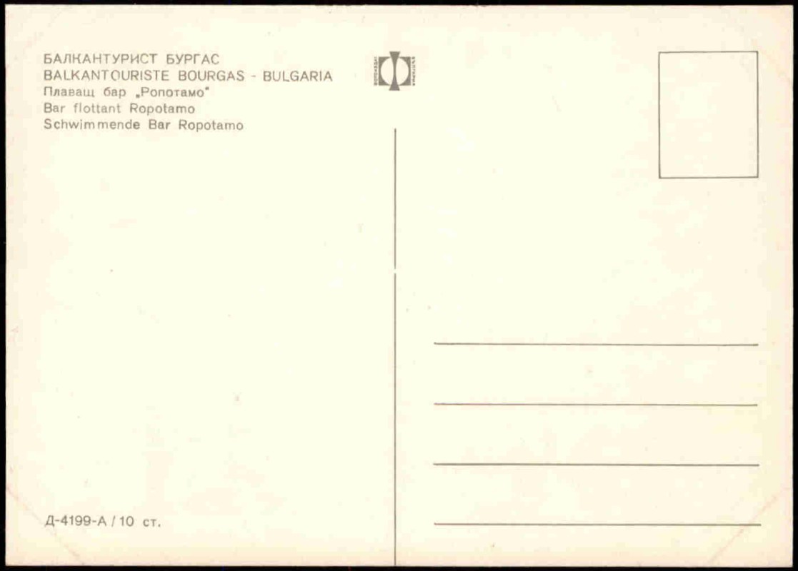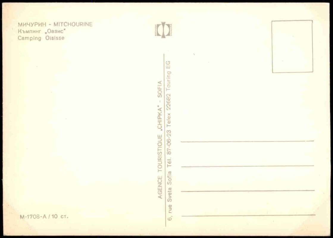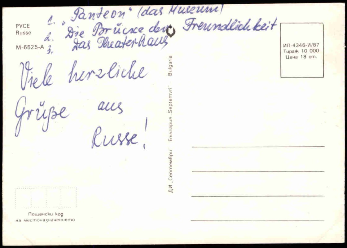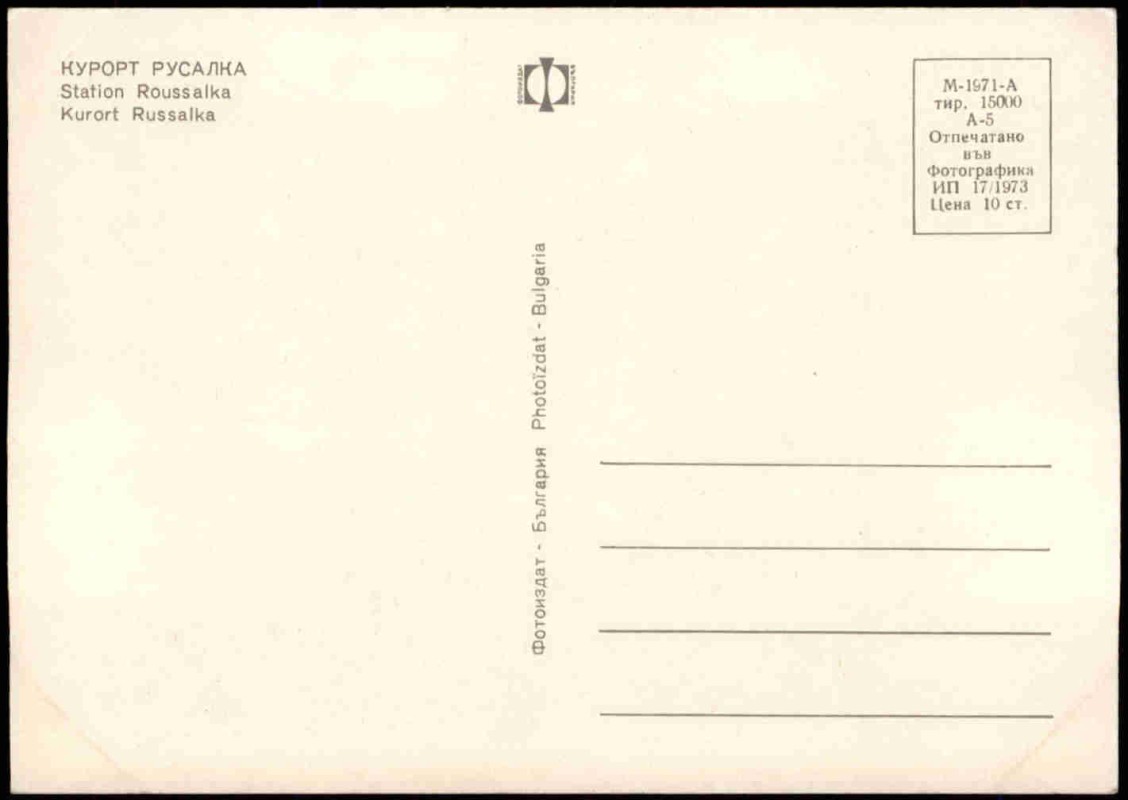 - БАЛКАНТУРИСТ БУРГАС BALKANTOURISTE BOURGAS BULGARIA Плаващ бар „Ропотамо" Bar flottant Ropotamo Schwimmende Bar Ropotamo A-4199-A/10 CT. ЗЛАТНИ ПЯСЪЦИ-общ изглед Zlatni plassatzi-vue générale Slatni Pjassazi-Gesamtansicht Снимка Ю. Томанов Д-2127-A/10 CT. Фотоиздат - България Photoizdat - Bulgaria КЪМПИНГ МИЧУРИН - MITCHOURINE Къмпинг "Оазис" Camping Oisisse M-1708-A/10 CT. Оформление Ив. Урумов Фотоиздат M-74/10 CT. CLUB AGENCE TOURISTIQUE CHIPKA SOFIA 6, rue Sveta Sofia Tél. 87-06-23 Telex 22682 Touring EG ULGARIE BUL ОАЗИС HECEGBP Пловдив- ИЗГЛЕД Vue de Plovdiv Plovdiv Ansicht Фотоиздат Акл - 2013 /10 ст. СТАНКЕ ДИМИТРОВ-общ изглед Stanké Dimitrov-vue générale Stanke Dimitrov-Gesamtansicht Акл - 2001/ 10 ст. 2.60 ВЕЛИНГРАД BEЛHEPAД- VÉLINGRAD ГРАД Оформление: художник П. Койчев Présentation artistique: peintre P. Koitebev ИСКЪРСКОТО ДЕФИЛЕ JDR 8 БЪЛГАРИЯ VEB Draftfahrzug instead - гис setchypwerk Belle 4K CMAAN Cheannme.ce СИЛИСТРА - центърът Силистра - центр Silistra das Zentrum © Сн. М. Минчев Пощенски кog на местоназначението A-20151-A tift България Septemvri Bulgaria ДИ Септември" НАЦИОНАЛЕН ПАРК-МУЗЕЙ „ШИПКА-БУЗЛУДЖА" PARC-MUSEE NATIONAL CHIPKA-BOUZLOUDJA-BULGARIA Паметникът на Свободата на Столетов връх Le monument de la Liberté au mont Stolétov Das Freiheitsdenkmal am Stoletov - Gipfel PYCE Russe M-6525-A Panteon (das Museum 2. Die Porucke den Freundlich keit gas Theaterhaus 3. България Septemvri Bulgaria A-776-A/10 CT. Пощенски коg на местоназначението nd พอเนอว" ท АСЕНОВГРАД - ASSENOVGRAD Асеновата крепост църквата св. Богородица Петричка - XII в. La forteresse d'Assen - l'église sv. Bogoroditza Petritchka- XIII es. Die Assen-Festung - die Kirche sv. Bogorodiza Petritschka - ип 2712-и/82 Tupaжk 5000 Цена 12 ст. 13 Jh. PYCE ип-4346-и/87 Tupaжk 10 000 Цена 18 ст. AKA-2001/10 qr. ВИДИН - VIDINE Крепостта „Баба Вида" La forteresse Baba Vida Die Festung Baba Wida Снимка: В. Искренов PYCAAKA КУРОРТ РУСАЛКА Station Roussalka Kurort Russalka РИЛА - връх Харамията Фотоиздат България Photoizdat - Bulgaria M-1971-A тир. 15000 A-5 Отпечатано BbB Фотографика ИП 17/1973 Цена 10 ст. ПО ВЪЗДУХА PAR AVION Каскада «Сестримо» Акл-2005 / 10 ст. Рила - Вершина Харамията Rila Rila le mont Kharamiata der Gipfel Charamijata Какви плавза Виждала былzapuя Septemvri НРБЪЛГАРИЯ 20 TAP (DDR) Nervena rolliche Holy Kreispoliklinik Karpater armick. Russe Пощенски код на местоназначението