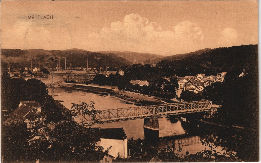 Ansichtskarte: Brücke, Stadt, Fabriken - gel. Feldpost - Mettlach