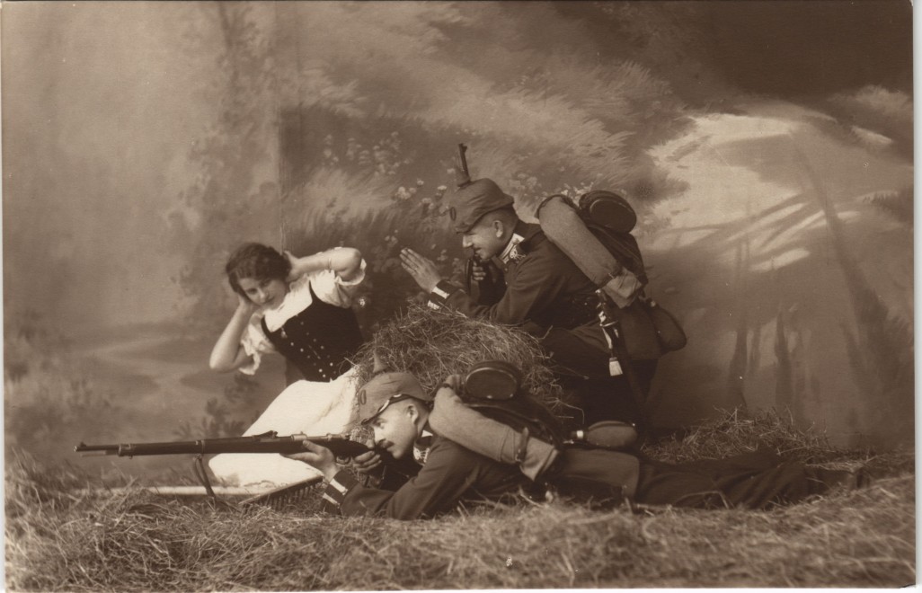 Ansichtskarte: Soldaten im Gefecht - erschrockene Frau Militaria Atelierfoto