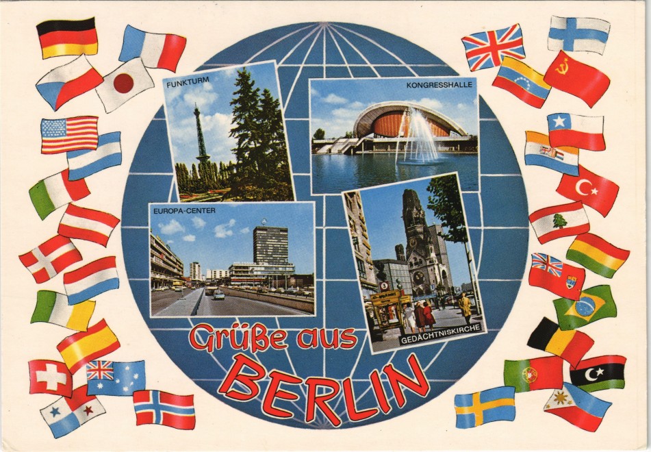 Foto Karte: Stadtteilansichten in Weltkugel und Länder-Flaggen - Berlin
