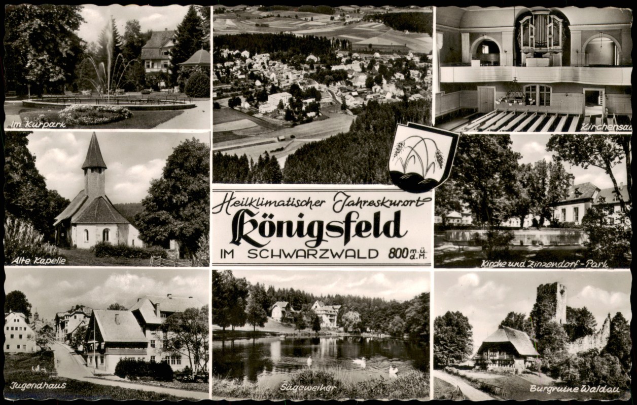 Foto Karte: Mehrbild-AK mit Jugendhaus, Alte Kapelle, Kurpark, Kirche uvm. - Königsfeld im Schwarzwald