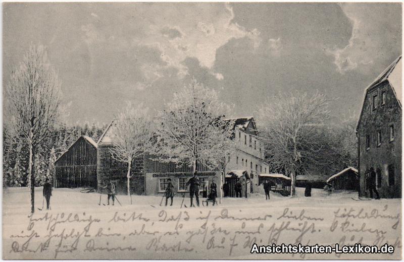 Ansichtskarte: Fischers Gasthof - im Winter (Skiläufer) - Holzhau-Rechenberg-Bienenmühle