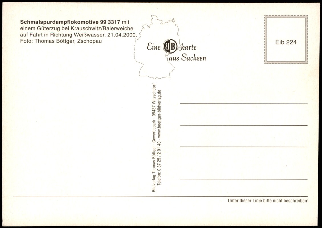 Foto Karte: Schmalspurdampflokomotive 99 3317 mit Güterzug bei Krauschwitz Baierweiche