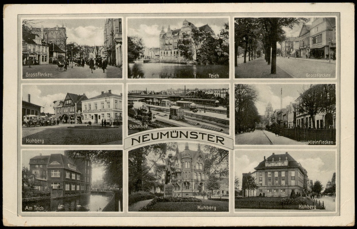 Ansichtskarte: Großflecken, Bahnhof, Kleinflecken, Kuhberg - Neumünster