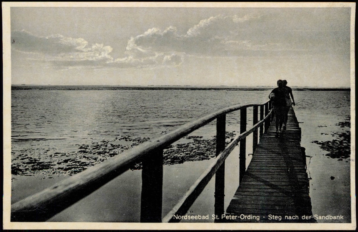 Ansichtskarte: Seebrücke zur Sandbank, Frauen Stimmungsbild - St. Peter-Ording
