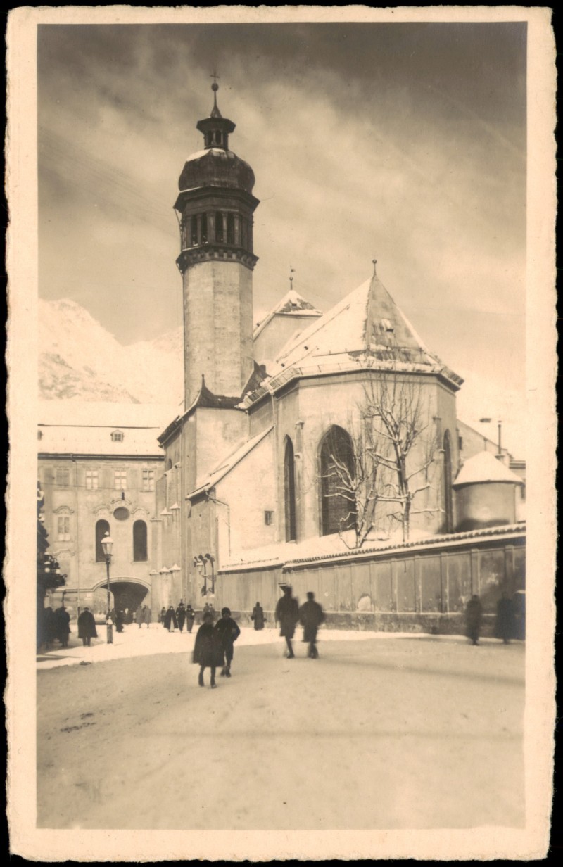 Ansichtskarte: Straßenpartie an der Kirche im Winter - Innsbruck