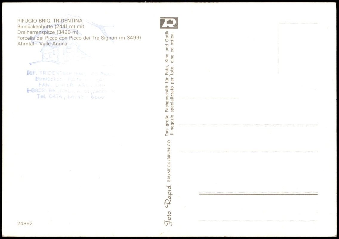 Foto Karte: Birnlückenhütte mit Dreiherrenspitze (3499 m) RIFUGIO BRIG TRIDENTINA - .Trentino-Südtirol