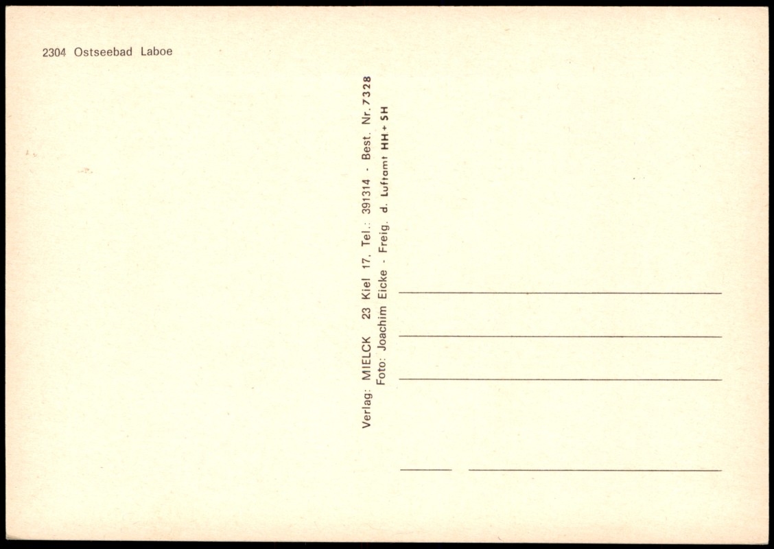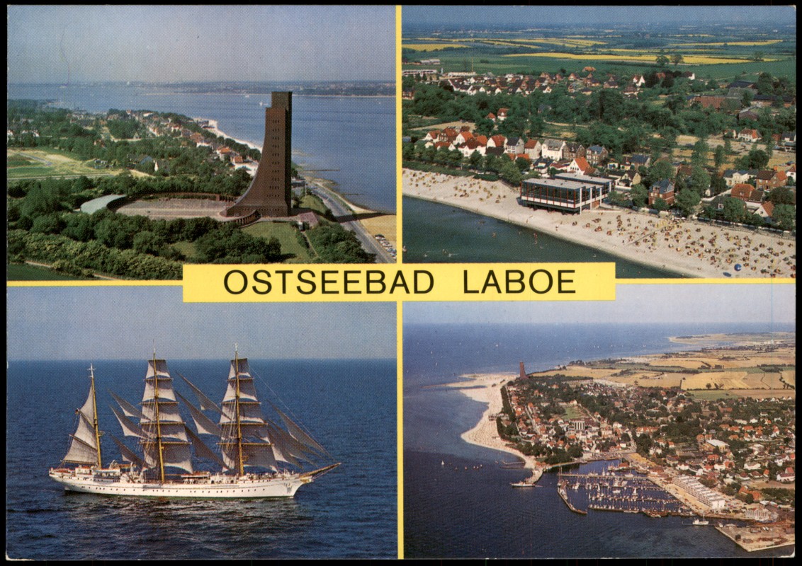 Foto Karte: Mehrbild-AK mit Marine-Ehrenmal, Luftaufnahme, Strand, Segelschiff - Laboe