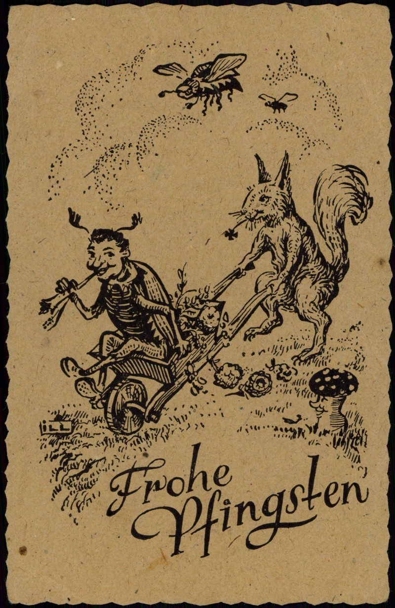 Ansichtskarte: Glückwunsch: Pfingsten - Künstlerkarte Käfer und Eichhörnchen