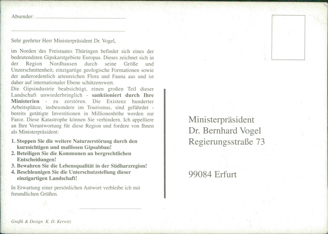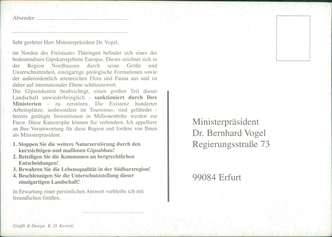 - Antwortkarte an Ministerpräsident Thüringen (Wehr gegen Gipsabbau im Südharz)