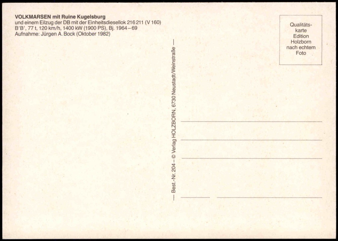 Foto Karte: Eilzug mit Einheitsdiesellok 216211 (V 160) bei VOLKMARSEN Ruine Kugelsburg