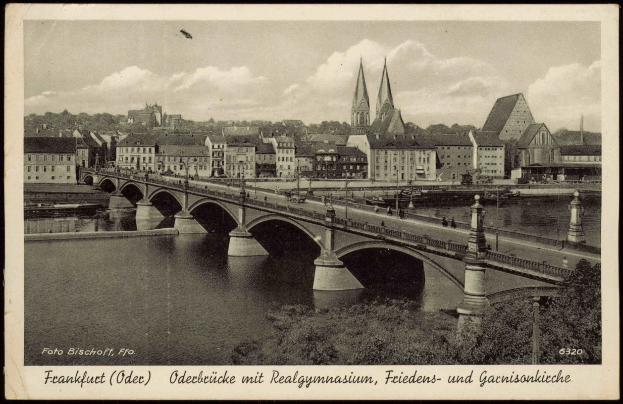 Ansichtskarte: Oderbrücke mit Realgymnasium, Friedens- und Garnisonkirche - Frankfurt (Oder)