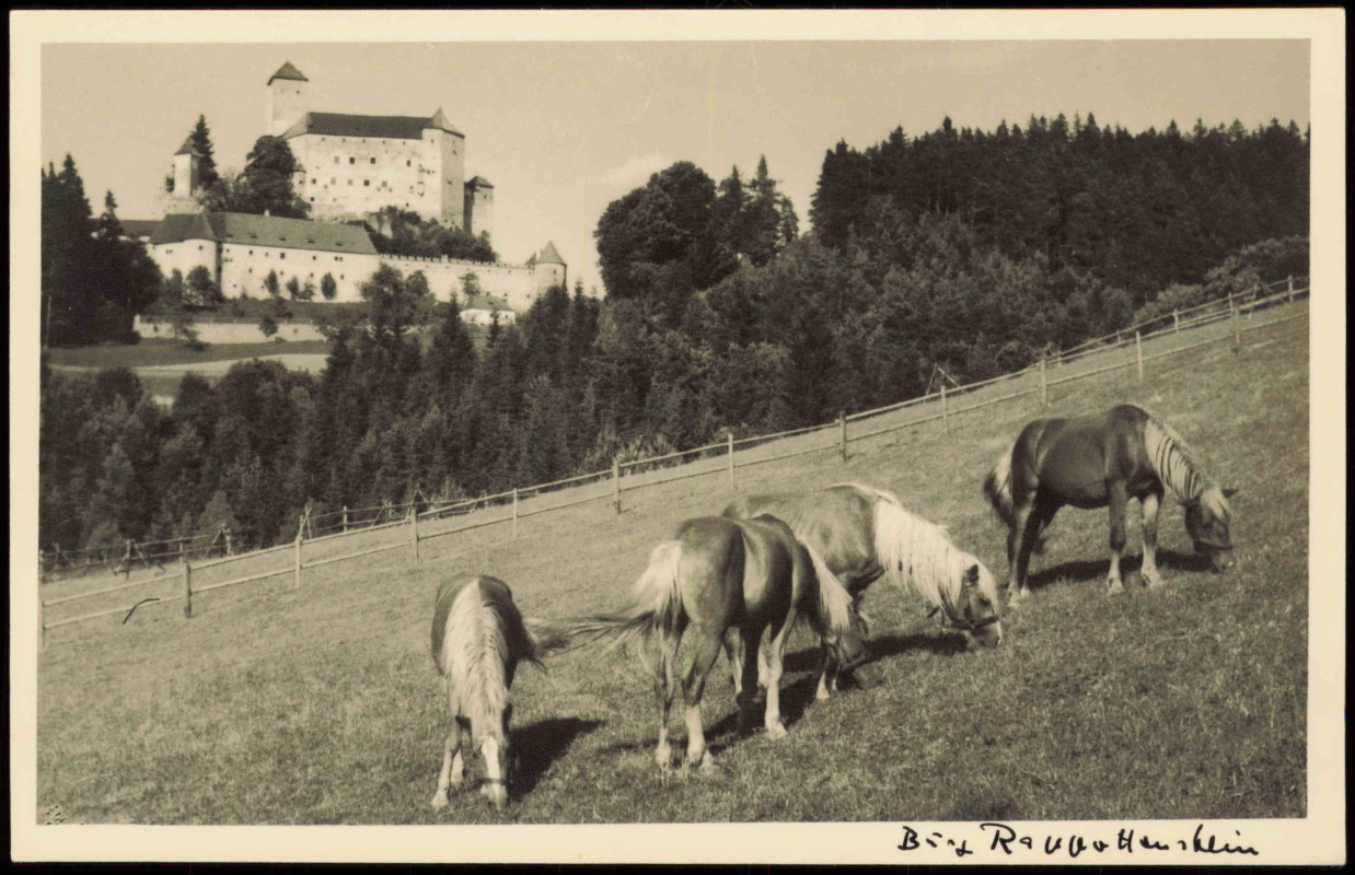 Ansichtskarte: Pferde auf der Koppel - Schloß - Rappottenstein (Bz. Zwettl)