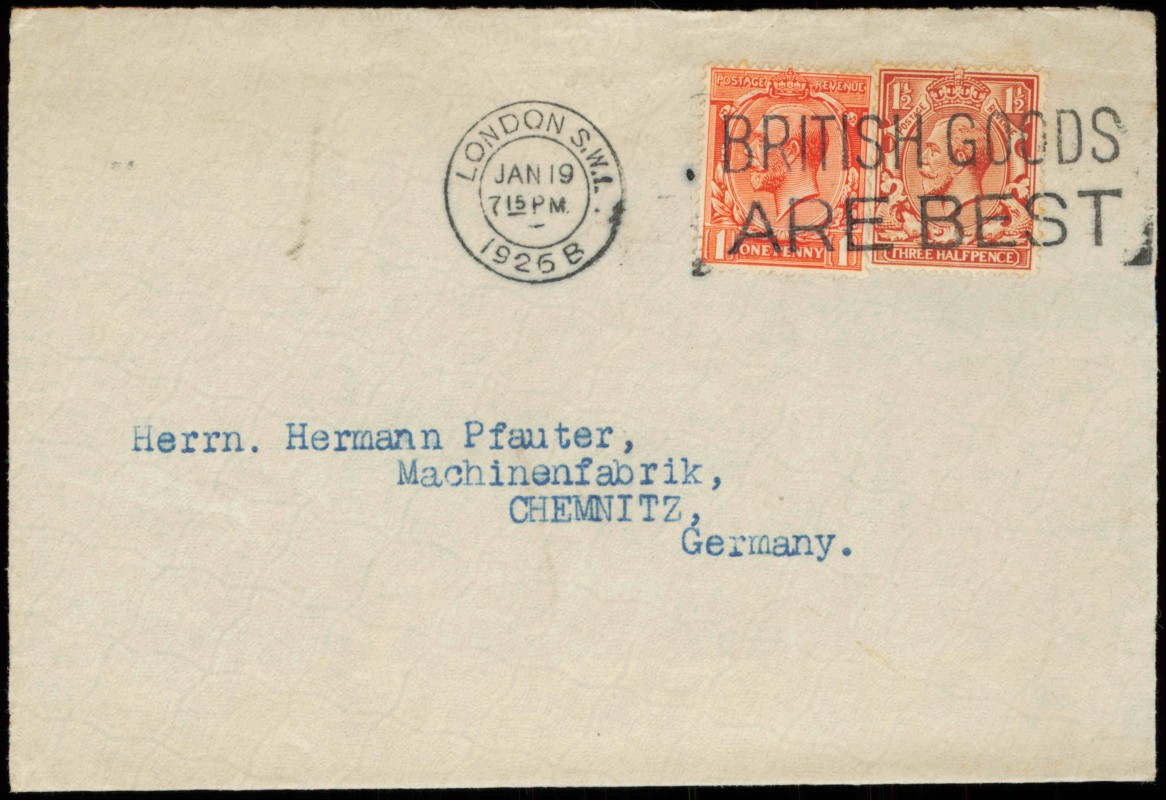 Briefmarke: Briefmarke 1-Penny 1½ Penny Stempel London British Goods are Best ➔ Hermann Pfauter Maschinenfabrik Chemnitz