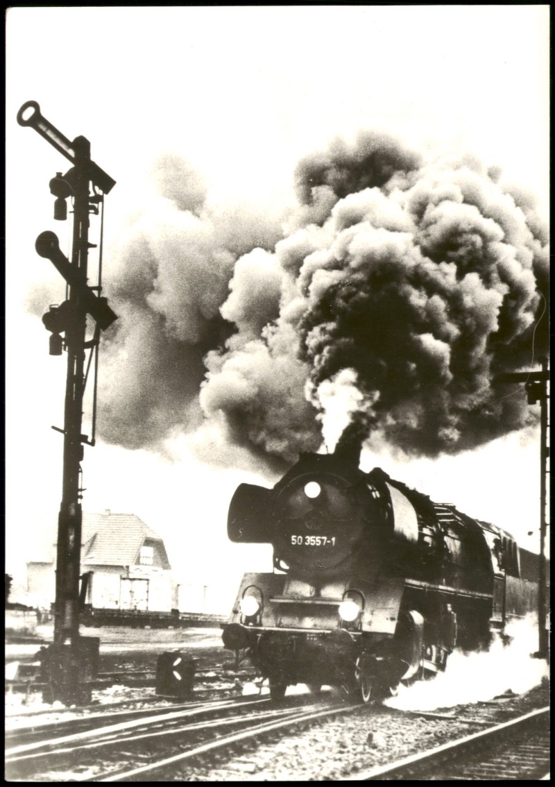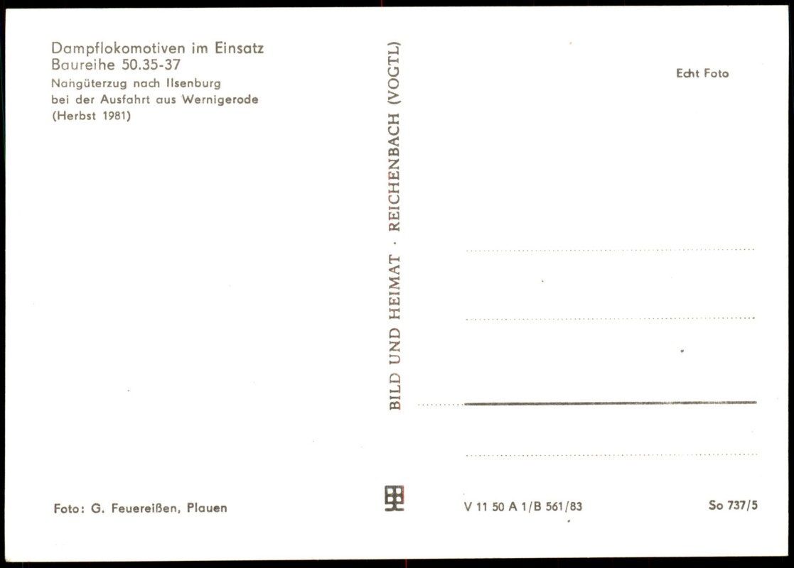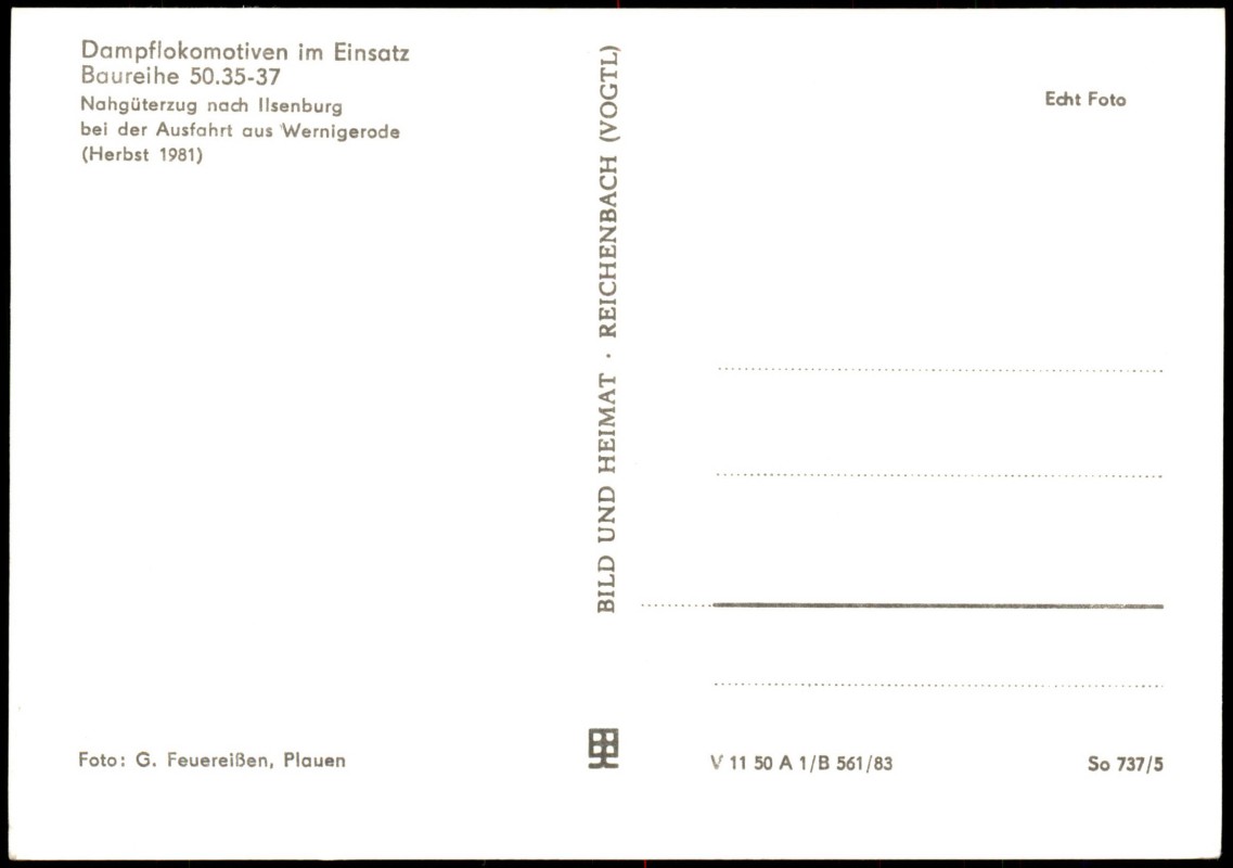 - Schwarz-Weiß-Aufnahme einer Dampflokomotive der Baureihe 50.35-37 (spezifisch 50 3557-1) im Einsatz, die einen Nahgüterzug nach Ilsenburg zieht. Das Bild zeigt die Lokomotive bei der Ausfahrt aus Wernigerode im Herbst 1981, umgeben von viel Dampf und Rauch. Die Karte ist ein Echt Foto. Der Fotograf ist G. Feuereißen aus Plauen. Herausgeber ist BILD UND HEIMAT REICHENBACH (VOGTL) mit der Seriennummer So 737/5.