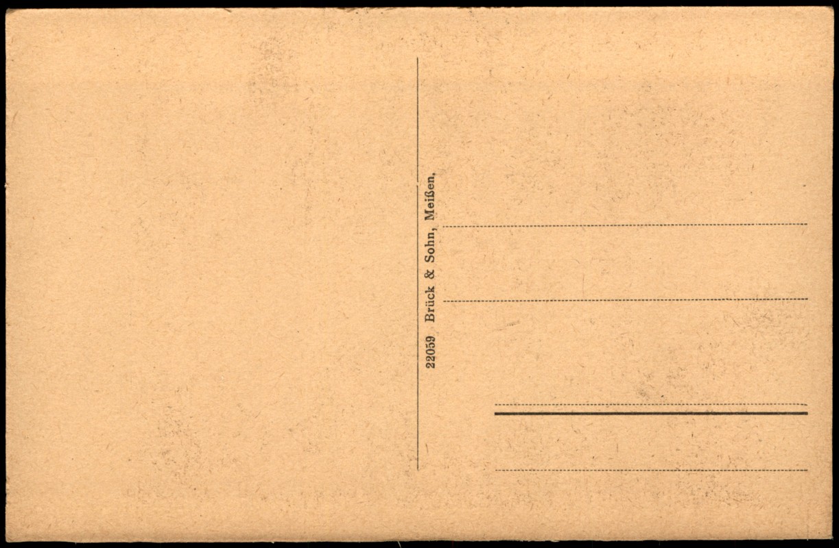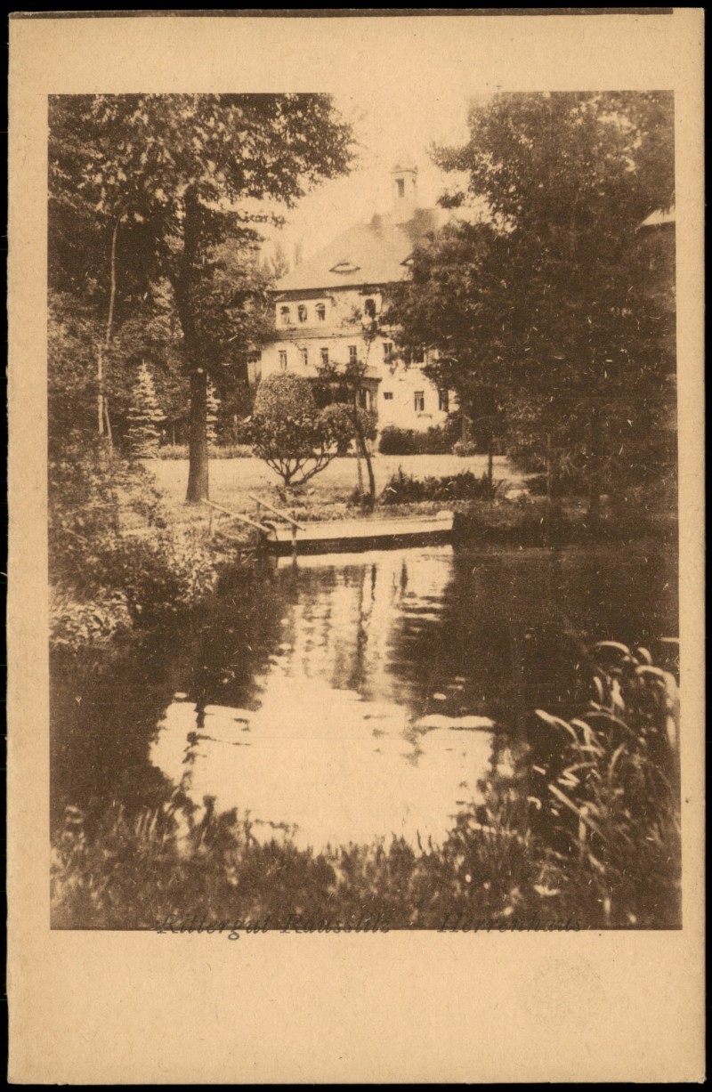 - Historische Ansicht des Herrenhaus mit Teich. Das Anwesen ist von üppigen Bäumen umgeben, und am Ufer ist ein kleines Ruderboot an einem einfachen Steg vertäut. Die Karte wurde vom Verlag Brück & Sohn aus Meißen mit der Seriennummer 22059 herausgegeben.