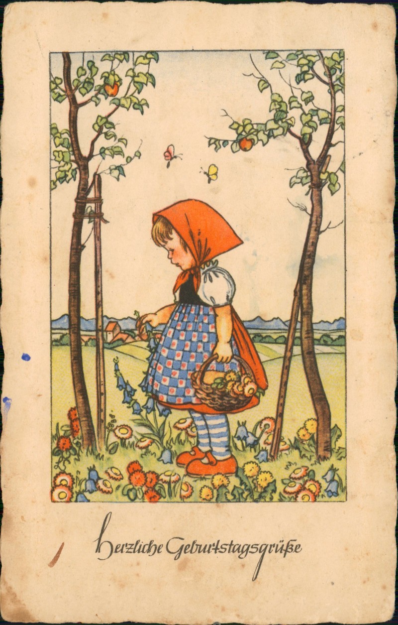 - Geburtstag Birthday Künstlerkarte Mädchen beim Blumenflücken