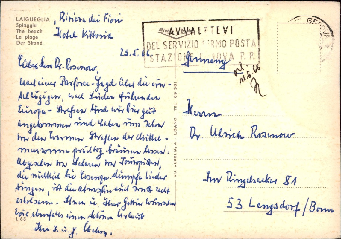 - Farbige Ansichtskarte von Laigueglia an der Riviera dei Fiori. Die Aufnahme zeigt einen weiten Blick über den belebten Sandstrand (Spiaggia) mit zahlreichen Sonnenschirmen und Badegästen. Im Hintergrund ist die historische Ortsansicht mit dem markanten Torre Saracena (Sarazenenturm) und dem Hotel Vittoria vor einer bewaldeten Hügelkulisse zu sehen. Auf einem Gebäude ist zudem eine Werbeaufschrift der Marke 'Agnesi' erkennbar.