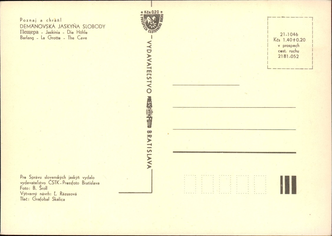 - Mehrbildkarte der Demänováer Freiheitshöhle (Demänovská jaskyňa slobody). Die Ansichten zeigen eine Sesselbahn in bewaldeter Umgebung sowie drei verschiedene Innenaufnahmen der Tropfsteinhöhle mit Stalaktiten und Stalagmiten. Herausgegeben vom Verlag ČSTK-Pressfoto Bratislava für die Správa slovenských jaskýň (Slowakische Höhlenverwaltung). Fotograf: B. Šroll. Grafischer Entwurf: L. Rázusová. Druck: Grafobal Skalica. Die Karte enthält einen Preisaufschlag zugunsten des Fremdenverkehrs.