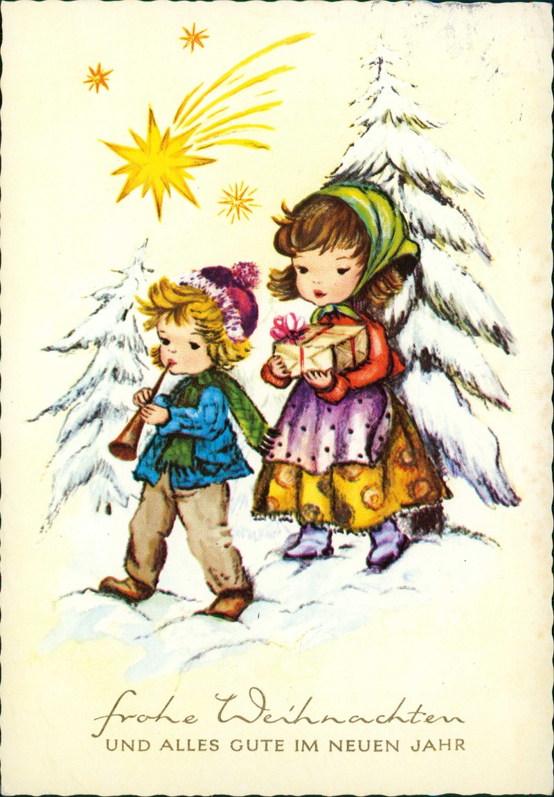 - Illustrierte Weihnachtskarte mit einer winterlichen Szene. Dargestellt sind zwei Kinder: ein Junge, der Flöte spielt, und ein Mädchen mit einem Geschenk in den Händen. Sie stehen neben einem verschneiten Tannenbaum unter einem großen gelben Weihnachtsstern. Der Text auf der Vorderseite lautet: 'frohe Weihnachten UND ALLES GUTE IM NEUEN JAHR'. Die Rückseite enthält den Aufdruck 'Made in West-Germany' und die Serienangabe 'Serie 33'.