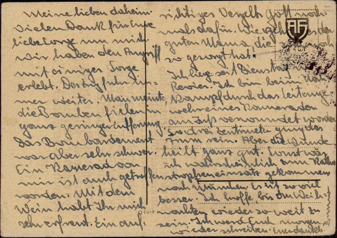 - Künstler-Postkarte mit dem Gedicht 'Heimat' von Gerhard Schumann. Die grafische Illustration im Holzschnitt-Stil zeigt eine stilisierte Stadtansicht mit Kirche und ist vom Künstler Michels signiert. Herausgegeben vom Auer-Verlag (Signet AF im Schild).