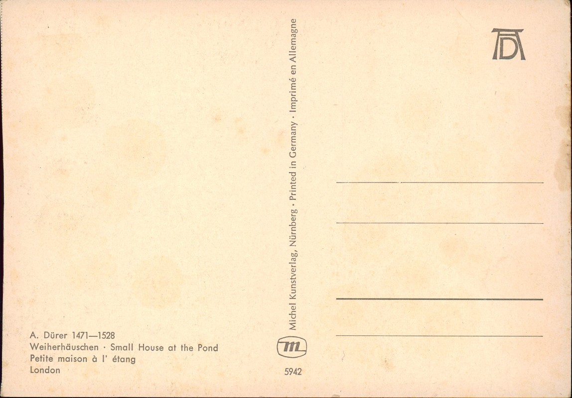- Kunstpostkarte mit einer farbigen Reproduktion des Aquarells 'Weiherhäuschen' von Albrecht Dürer (1471-1528). Das Motiv zeigt ein kleines Fachwerkhaus auf einer Insel inmitten eines Weihers, im Vordergrund ist ein Kahn am Ufer zu sehen. Das Original des Werkes befindet sich in London. Herausgegeben vom Michel Kunstverlag, Nürnberg, unter der Seriennummer 5942.