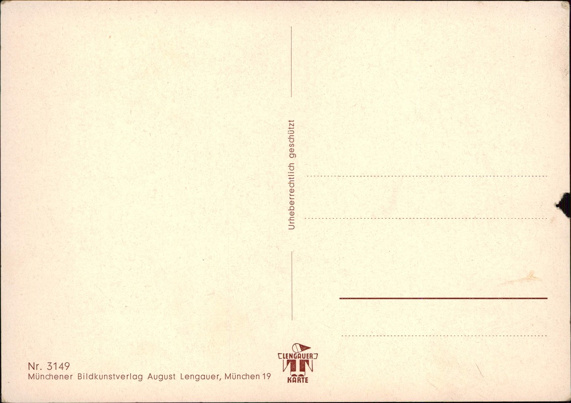 - Farbig illustrierte Postkarte aus dem Münchener Bildkunstverlag August Lengauer. Das Motiv zeigt ein junges Paar in bayerischer/alpiner Tracht (Lederhose und Dirndl). Der Mann umarmt die Frau und lehnt seinen Kopf an ihre Brust, während sie ein rotes Lebkuchenherz hält. Im Vordergrund sind Bierfässer und eine Tannengirlande mit einem Hut abgebildet. Der Text lautet: 'Ich möcht so gern Dein Herzklopfen hörn!'.