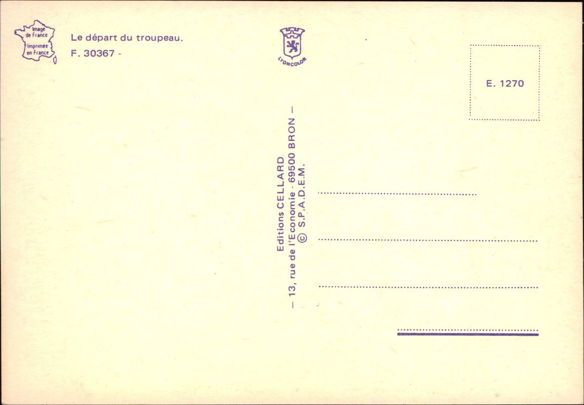 - Moderne Farbfotografie (Lyoncolor) einer Schafherde mit Hirten auf einem steinigen Pfad. Die Szenerie ist eingebettet in eine grüne Tal- und Gebirgslandschaft mit vereinzelten Gehöften und steilen Felswänden im Hintergrund. Die Karte wurde von Editions Cellard in Bron herausgegeben und trägt das Logo 'Image de France' sowie den Copyright-Vermerk der S.P.A.D.E.M.
