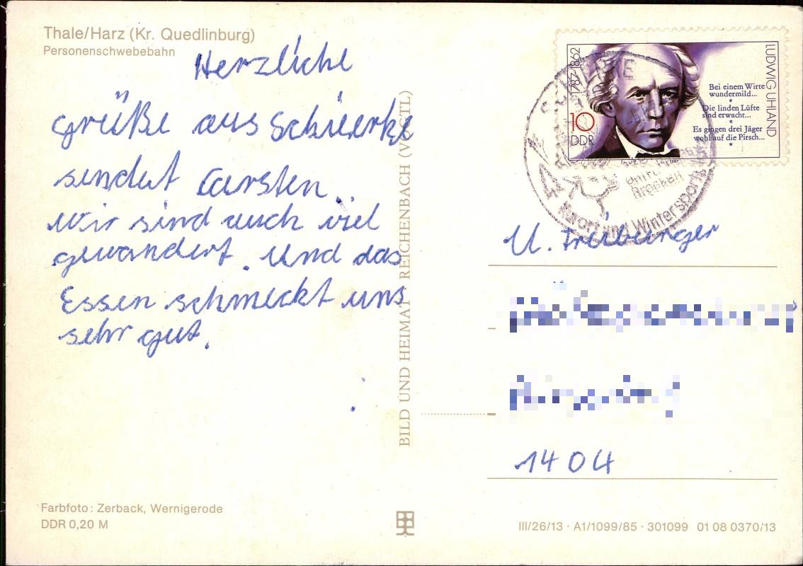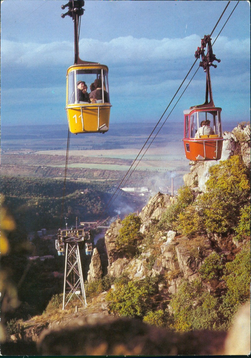 - Farbfotografie der Personenschwebebahn in Thale (Harz). Die Ansicht zeigt eine gelbe (Nr. 11) und eine rote Gondel in luftiger Höhe über der felsigen Landschaft des Bodetals. Herausgegeben vom Verlag Bild und Heimat Reichenbach (Vogtl). Das Farbfoto stammt von Zerback, Wernigerode. Die Karte trägt die Kennung BEK DDR 0,20 M sowie die Druckgenehmigungsnummer A1/1099/85.
