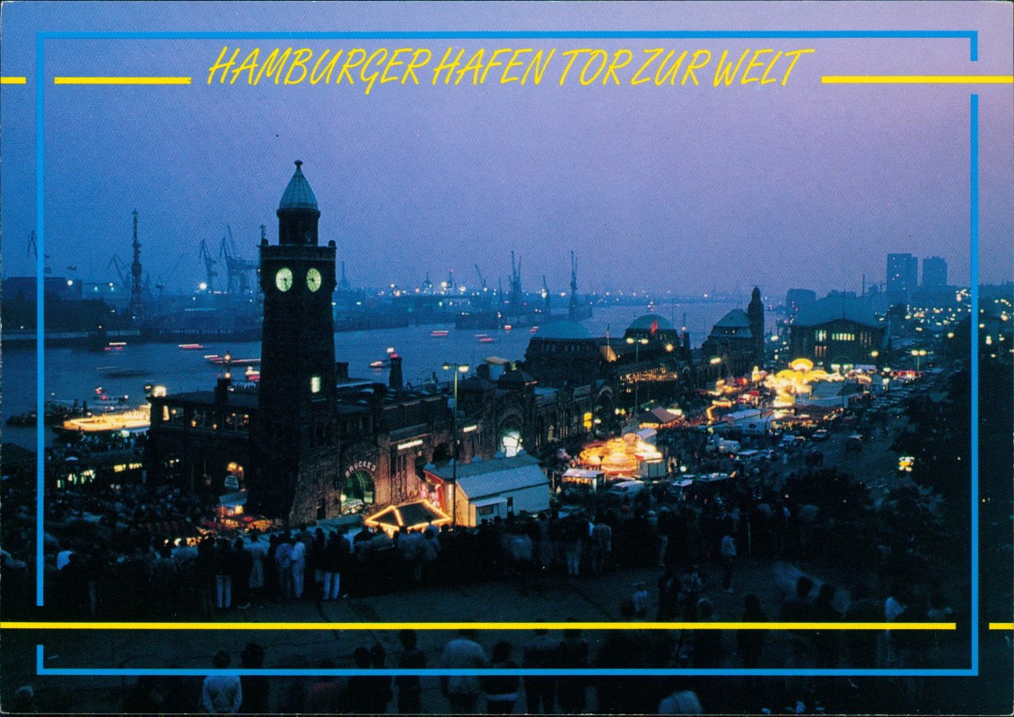 Foto Karte: Hafen mit Landungsbrücken bei Dämmerung - St. Pauli-Hamburg