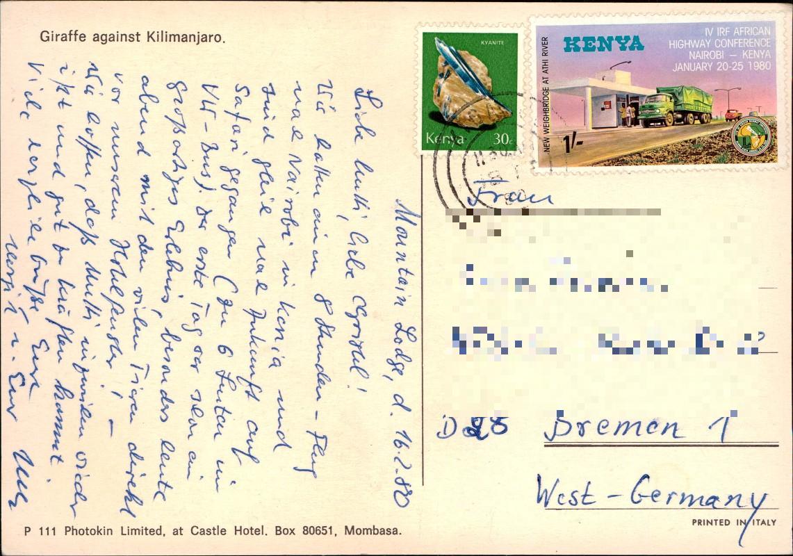 - Farbfotografie zweier Giraffen in der afrikanischen Savanne mit dem schneebedeckten Mount Kilimanjaro im Hintergrund. Die Karte wurde von Photokin Limited (Mombasa) herausgegeben und in Italien gedruckt. Auf der Rückseite befindet sich ein offizieller Aufdruck zur 'IV IRF African Highway Conference', die im Januar 1980 in Nairobi stattfand.