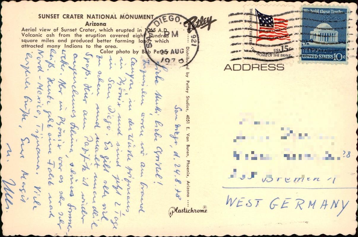 - Farbige Luftaufnahme des Sunset Crater National Monument in Arizona. Die Karte zeigt die vulkanische Landschaft und den Krater aus der Vogelperspektive. Laut rückseitigem Text brach der Vulkan 1065 n. Chr. aus. Farbfoto von Bob Petley. Hergestellt im Plastichrome-Verfahren, vertrieben durch Petley Studios, Phoenix, Arizona.