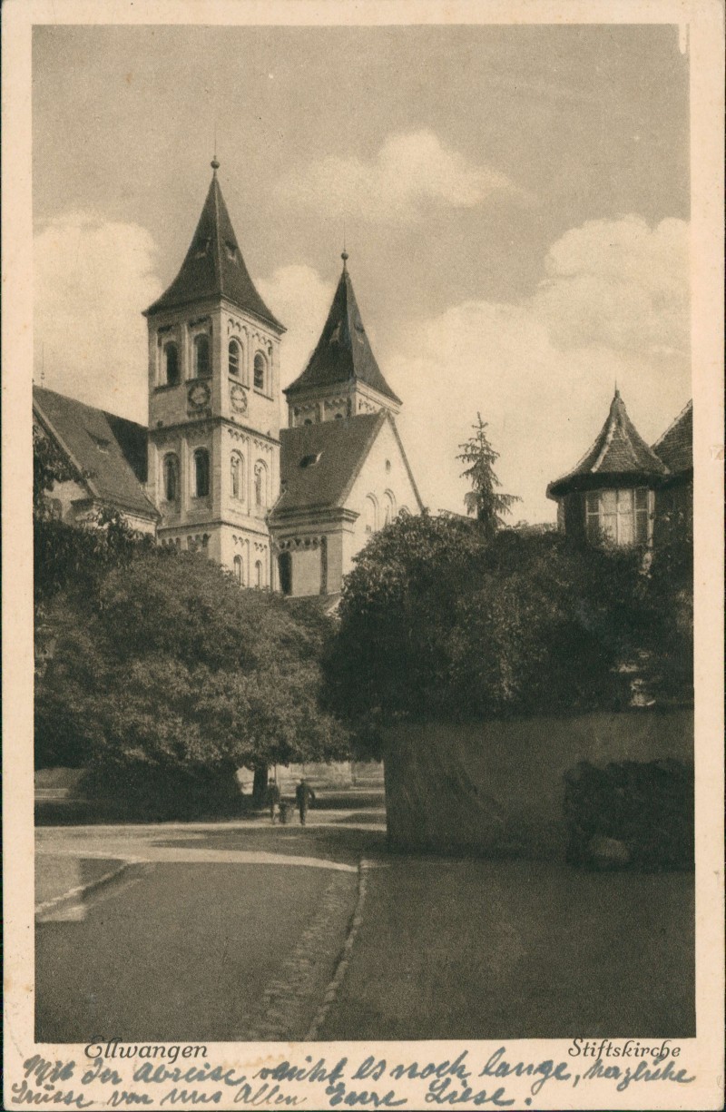 Ansichtskarte: Stifts- und ev. Stadtkirche, Straßenszene - Ellwangen (Jagst)