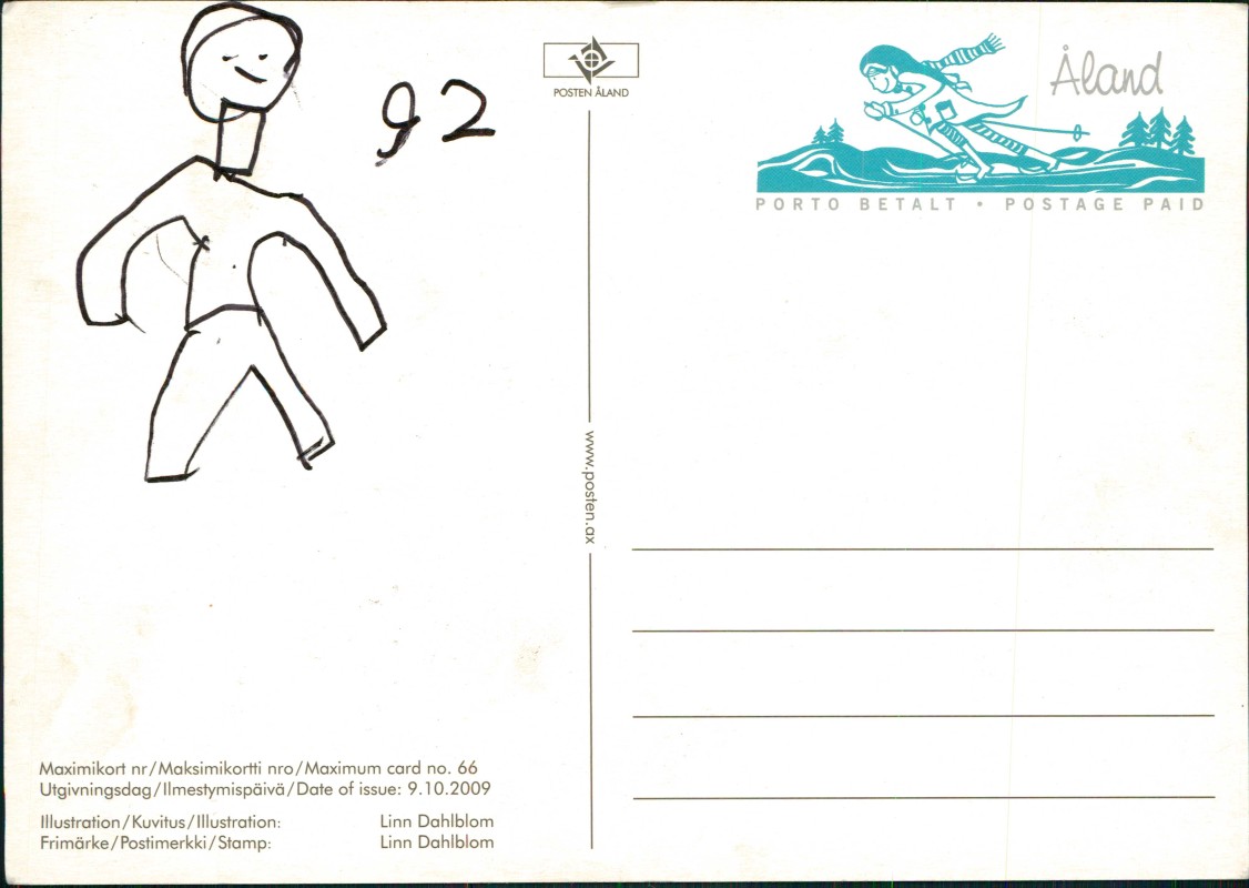 - Offizielle Maximumkarte (Nr. 66) der Posten Åland zur Weihnachtsausgabe 2009. Die Vorderseite zeigt eine stilisierte Illustration von Linn Dahlblom: Ein lächelndes Mädchen in roter Kleidung sitzt auf einer großen, bunt gestreiften Christbaumkugel, flankiert von Geschenken und silbernen Herzen. Die Rückseite enthält die Verlagsangaben (www.posten.ax) sowie eine große handschriftliche Zeichnung einer Figur.