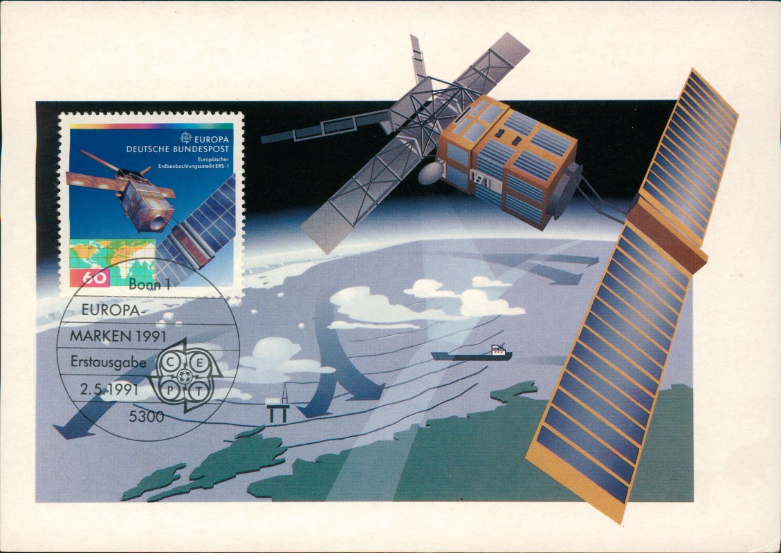 - Maximumkarte der Edition Maxiphil zur Europa-Marke 1991 'Weltraumfahrt'. Das Motiv zeigt eine Illustration des ersten europäischen Erdbeobachtungssatelliten ERS-1 im Weltraum über der Erdoberfläche. Der Satellit dient der Beobachtung von Ozeanen, Meeresströmungen sowie der Vermessung von Regenwäldern und der Arktis zur Erforschung des Treibhauseffekts. Foto: Dornier GmbH, Friedrichshafen.