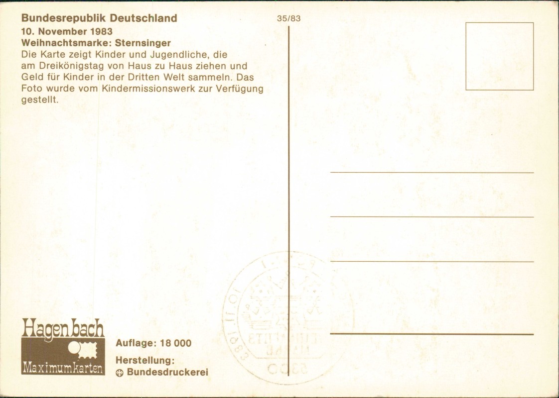 - Maximumkarte der Bundesrepublik Deutschland zur Weihnachtsmarke 1983. Das Motiv zeigt eine Gruppe von Kindern und Jugendlichen als Sternsinger, die am Dreikönigstag Spenden für Kinder in der Dritten Welt sammeln. Das Foto wurde vom Kindermissionswerk zur Verfügung gestellt. Herstellung durch die Bundesdruckerei für den Verlag Hagenbach.