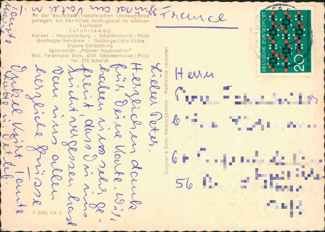 - Mehrbild-Ansichtskarte der Bienwaldmühle, gelegen an der deutsch-französischen Landesgrenze im Bienwald. Die Vorderseite zeigt verschiedene Ansichten: das Hauptgebäude, die bewirtete Außenterrasse sowie die umliegende Flusslandschaft. Rückseitig sind Informationen zum Inhaber Ferdinand Roth, der gutbürgerlichen Küche mit eigener Schlachtung (Spezialität: Pfälzer Hausmacher) sowie der Zufahrtsweg über Kandel, Neulauterburg und Scheibenhardt aufgeführt.