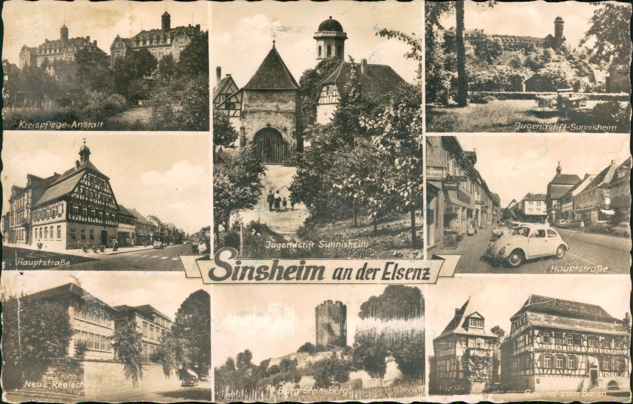 Foto Karte: Mehrbildkarte mit Ortsansichten u.a. Hauptstraße Kreispflege-Anstalt uvm. - Sinsheim