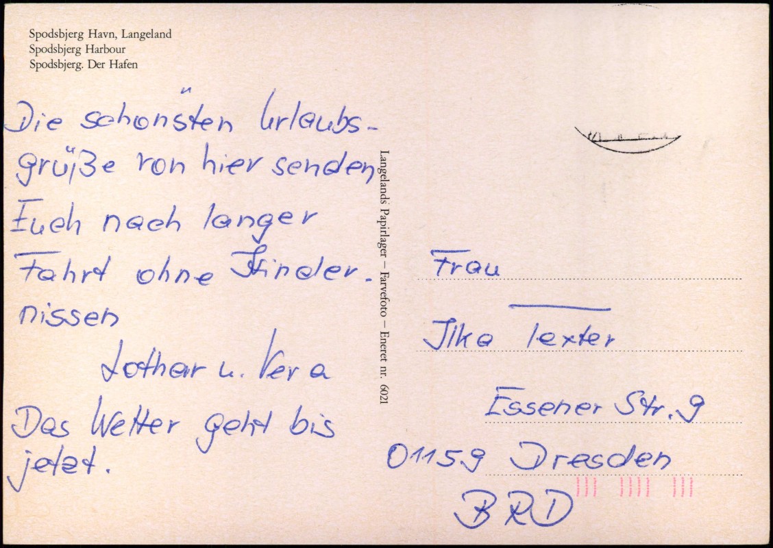 - Farbfotografie des Hafens von Spodsbjerg auf der dänischen Insel Langeland. Die Ansicht zeigt im Vordergrund verschiedene Fischerboote (u.a. mit der Kennung RU 55) und Segelyachten an Holzstegen. Im Hintergrund ist eine große weiße Autofähre am Kai zu sehen. Herausgegeben von Langelands Papirlager, Eneret nr. 6021.