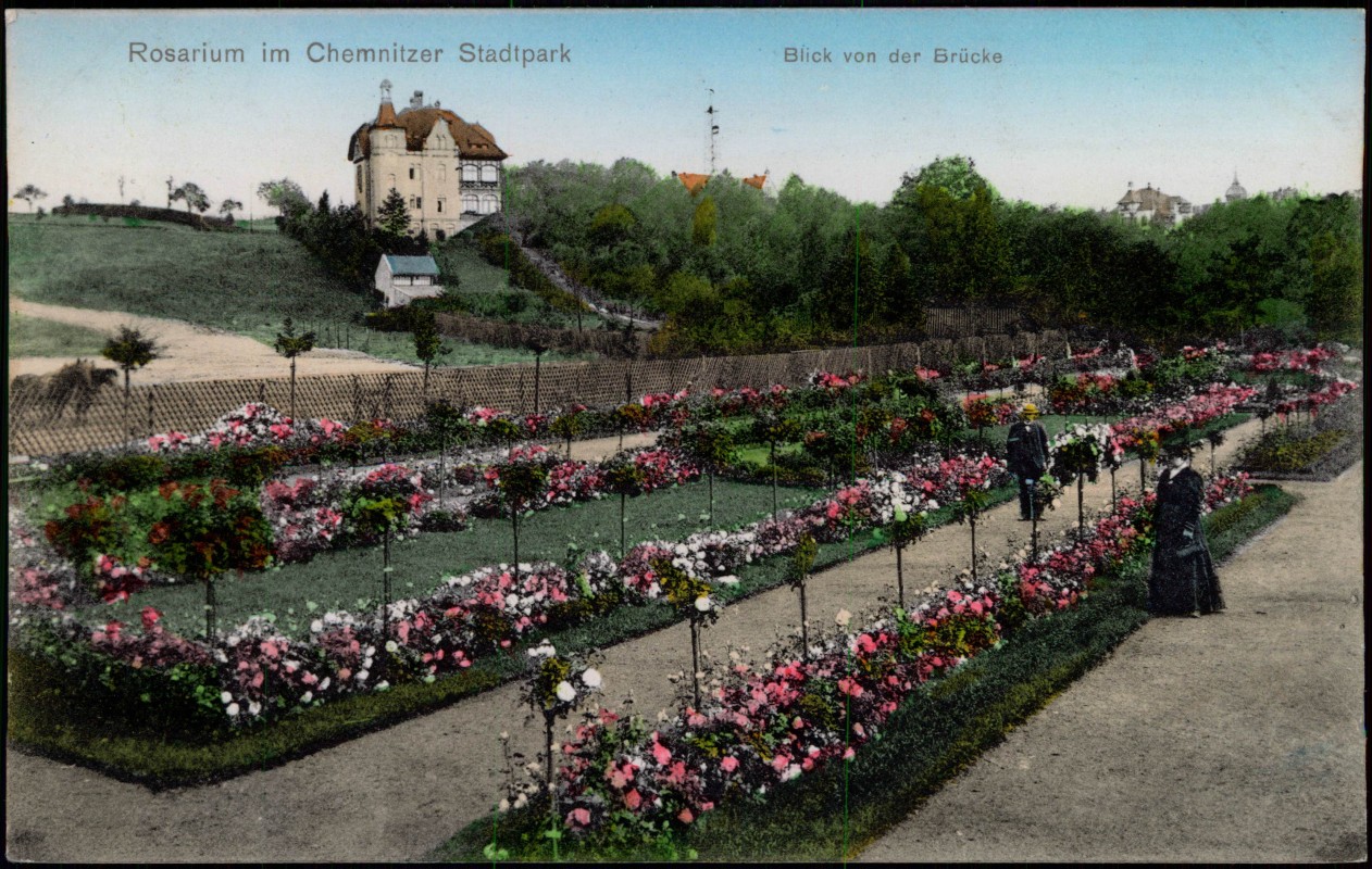 Ansichtskarte: Rosarium im Stadtpark Blick von der Brücke - Chemnitz