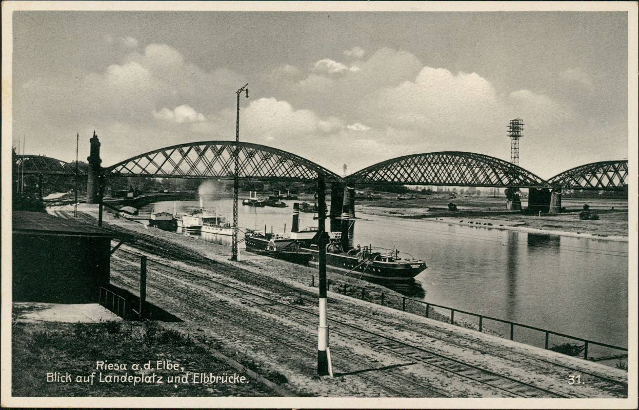 Ansichtskarte: Blick auf Landeplatz und Elbbrücke. Dampfer - Riesa