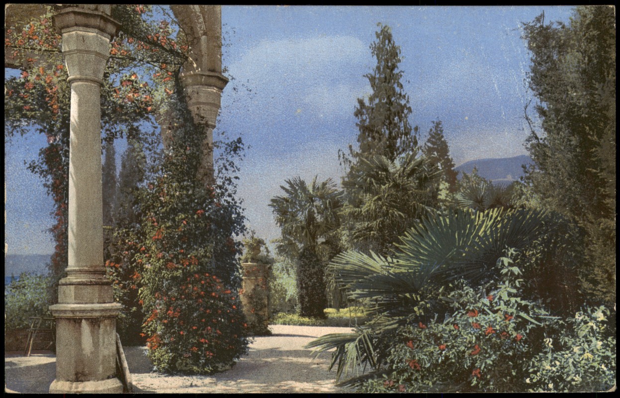 Ansichtskarte: Photochromiekarte Stimmungsbild Natur Botanik Säulen-Bau (vermtl. Italien)